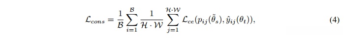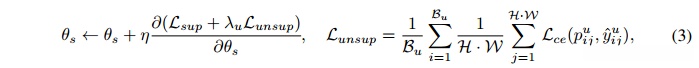式中,在训练批次中具有分辨率为H×W且被标注的对象图像数目为l_{i,j};Lce则代表了应用于第i个被标注对象图像上、每个像素点j处所计算出的一个逐像素交叉熵损失值。其中p_{1,i,j}是对学生模型所赋予被标注对象图像的结果预测;y_{1,i,j}则是相应被标注对象图像的真实标签映射结果。在本研究工作中,默认地将这种有监督的学习损失整合到学生模型架构之中;而未被标注的数据所对应的无监督学习问题将在下一小节详细阐述。教师网络参数θ_t通过采用学生网络参数θ_s经过指数移动平均(EMA)算法计算得到: