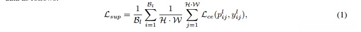 在式中, θs表示掉落比例τ的学生模型子模型参数,其中B代表训练批次中的图像数量。特别地,在此研究工作中,默认情况下仅对教师网络和学生网络的输入施加弱化增强处理,这一做法与方程组(Equation)3中的处理方式不同:方程组(Equation)3则采用了不同的策略,即针对学生的强化学习方法结合 teacher-student知识 Distillation框架进行数据增强处理。最后,最终所提出的损失函数将被整合到Lunsup框架下协同优化学生的网络参数更新过程。