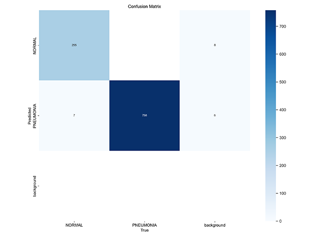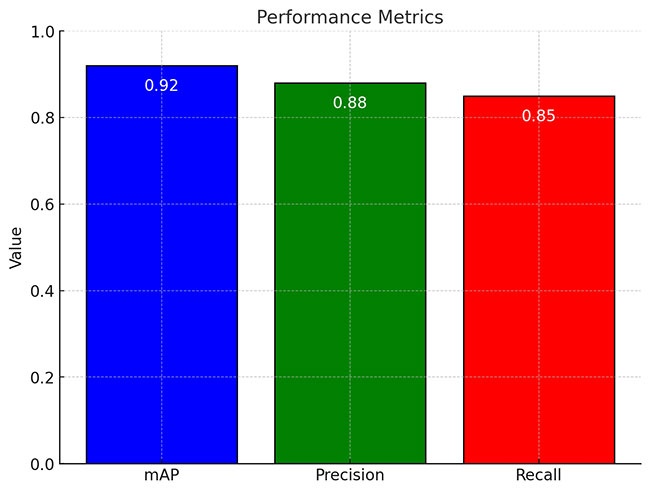 该模型的性能评估指标mAP值、Precision值与Recall值分别以蓝色、绿色与红色的形式标注出来。各评估指标均表现出了较高水平的状态,在多个关键领域展现了卓越的表现能力