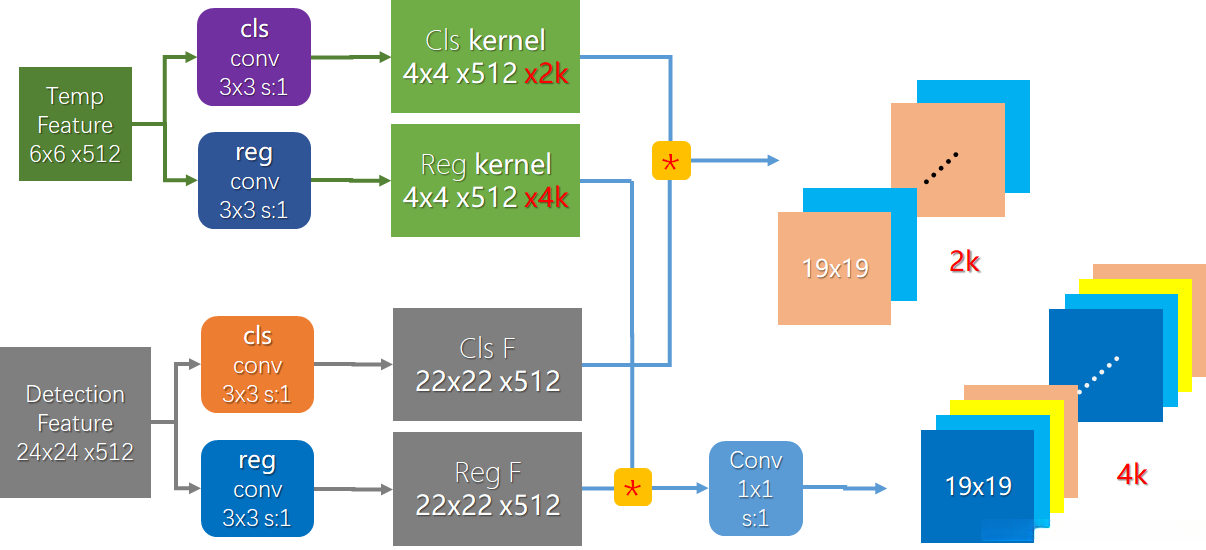 紧接着上一步孪生网络的输出,模板分支输出经过不同卷积后得到两个尺寸一样(4*4),通道数不同的结果,通道数分别为2k(上图Cls kernel)与4k(上图Reg kernel),其中k是RPN的anchor比例尺度,论文里设置是[0.33, 0.5, 1, 2, 3]共5种尺度。通道数2k的要用于分类分支计算,因为要计算相应位置是目标(前景)及背景的概率2个值。通道数4k的要用于回归分支计算,计算出相应位置目标相对于预设anchor值的偏移量,包括dx、dy坐标偏移量与dw、dh长宽偏移量。