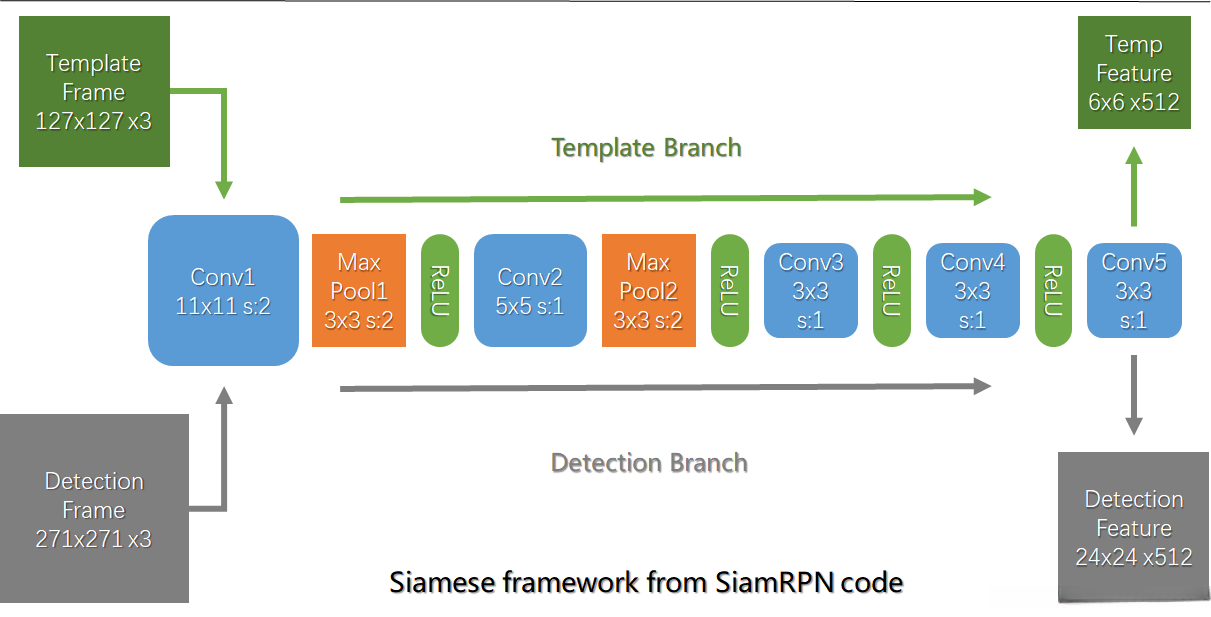 孪生网络部分与SiameseFC类似,都是AlexNet的变体,具体参数见上图,使用的是在github上开源的代码中设置的参数。模板帧(初始帧的目标图像)与待检测帧都使用同一网络提取特征,这就是孪生网络。