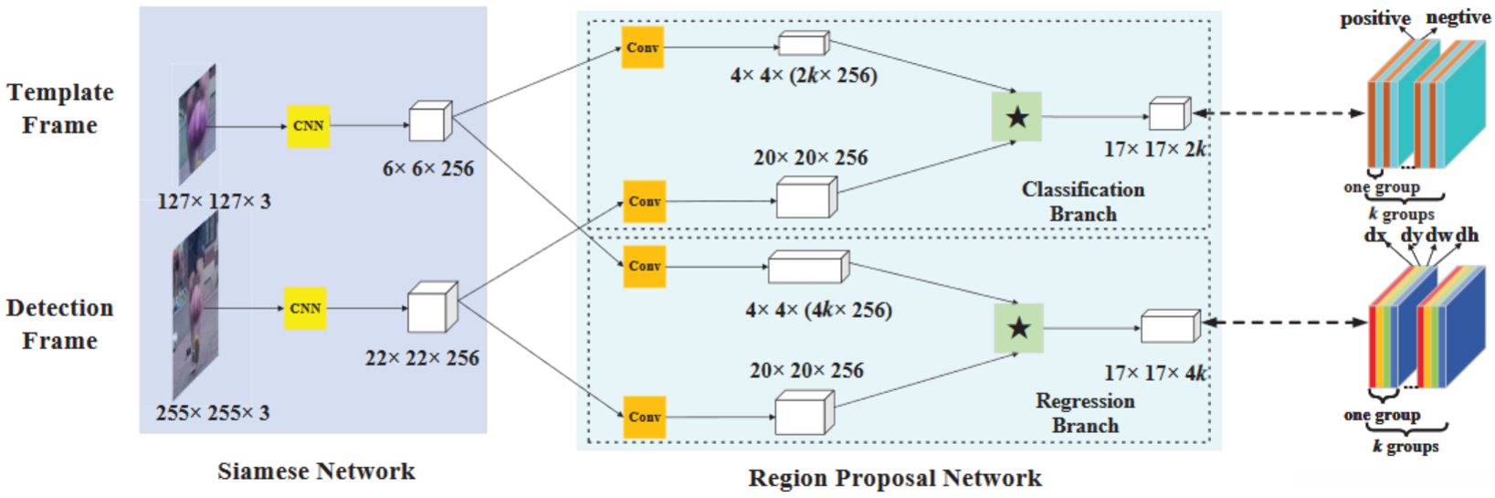 简单来说,RPN部分就是用初始帧目标图像经过Siamese网络提取的特征作为卷积核,与待检测帧图像经过Siamese网络提取的特征进行卷积计算,得到分类特征图与回归特征图。