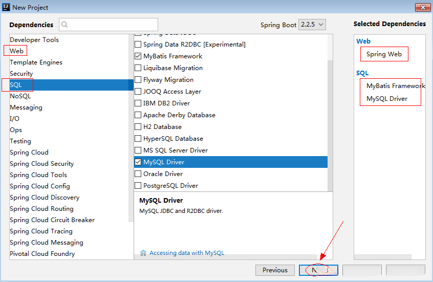 4、项目依赖选择,Web分组:spring web,SQL分组:mybatis、mysql,点击“Next”