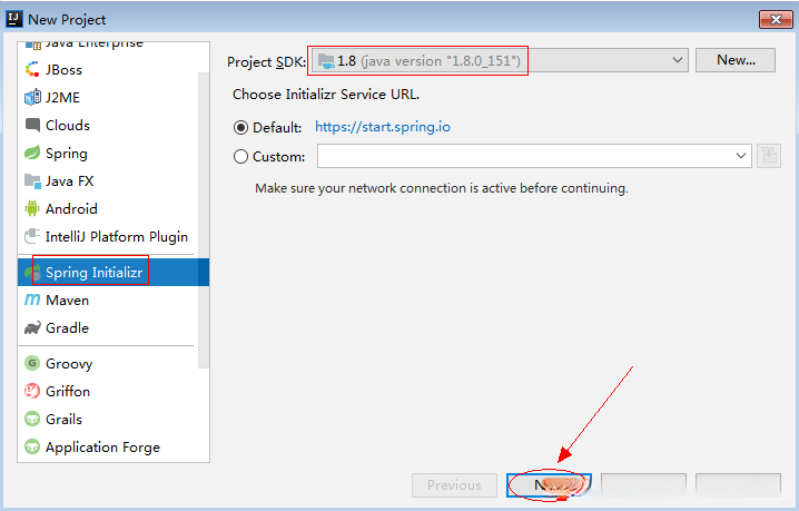 2、模板选Spring Initializr,选SDK(即JDK),点击“Next”