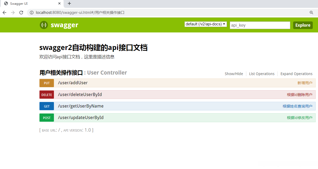 在本地启动项目后, 可进入 swagger2 自动生成的 api 接口文档, 并访问 http://localhost:8080/swagger-ui.html#