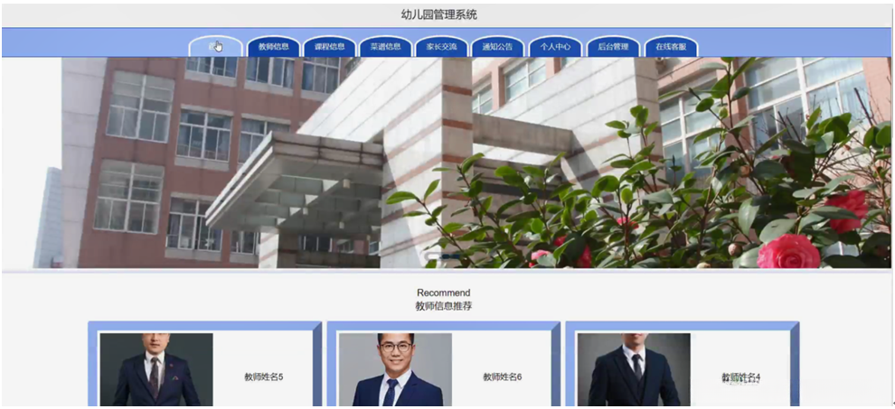 YXJY幼儿园管理系统,在首页界面中可查看包含首页页面、教师资料库、课程安排表、膳食食谱等信息以及家长交流区等功能模块的具体操作流程(如图5-1所示)。
