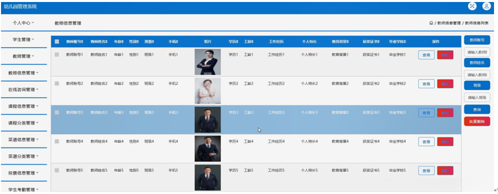 在‘教师管理’页面中支持查看与更新各类基本信息,并能根据需要完成相关操作