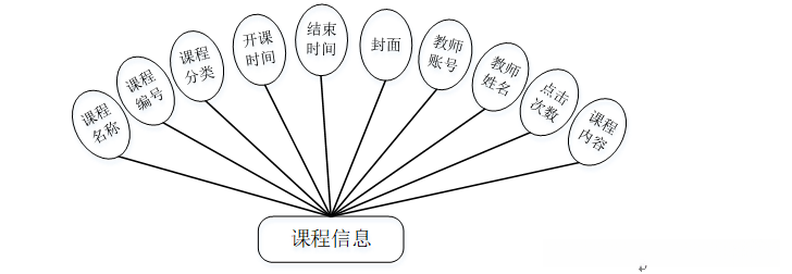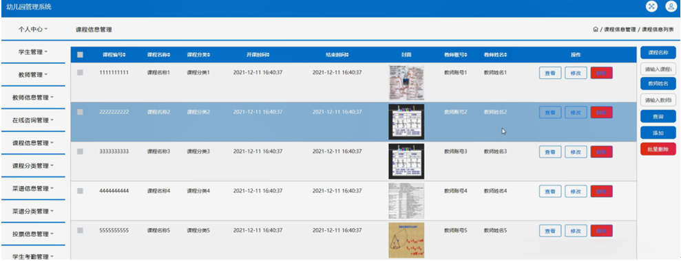 课程信息化管理,在该页面上可供查看修改删除等操作的内容有课程编号、课程名称、课程分类、开课时间、结束时间及封面等信息;同时还有教师账号及教师姓名等数据信息