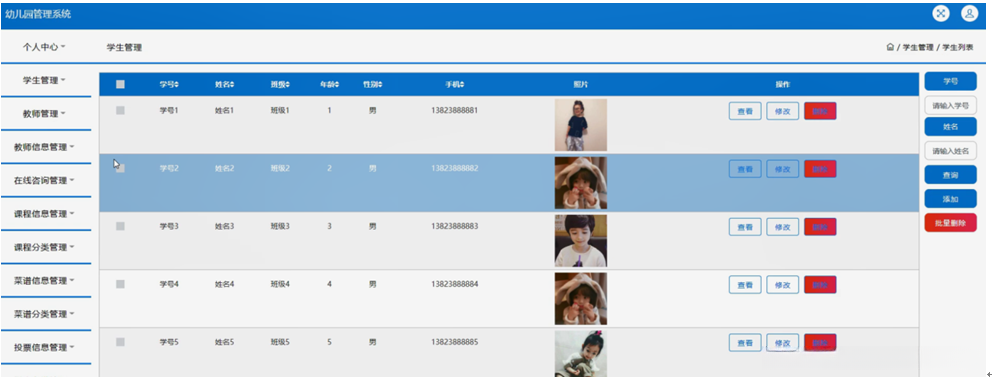 在'学生管理'页面上可对学号姓名班级信息进行查询和更新相关操作;年龄性别手机号码以及照片信息可进行查询和移除相关操作。