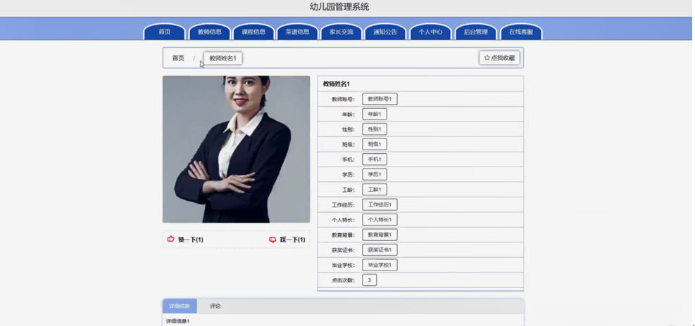 教师可以在其个人信息页面查看包括但不限于以下详细内容:教师姓名及其对应的教学账号信息(即包含其所在班级的信息),以及与之相关的照片(即教学照片)、联系方式(即师生沟通联系方式)、学历记录(即教育背景中的学历数据)、工作年限数据(即工作经历列表),个人技能展示区(即专业特长领域)以及荣誉证书库(即获奖证书)。此外系统还支持用户进行评论和收藏等功能项的操作,并对各页面内容提供访问权限管理功能,并以图5-2所示界面形式呈现相关操作流程