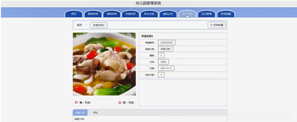 菜谱信息位于菜谱信息页面上可以查看包括菜谱名称编号分类图片票数口味日期点击次数等内容 并支持评论与收藏等功能