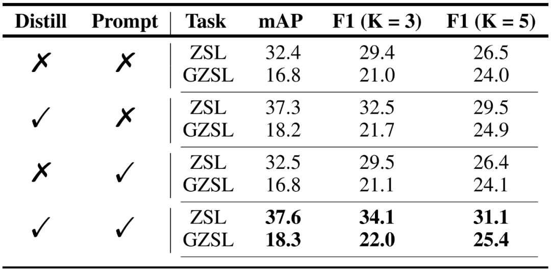 表 2. 知识蒸馏和提示学习对实验结果的影响