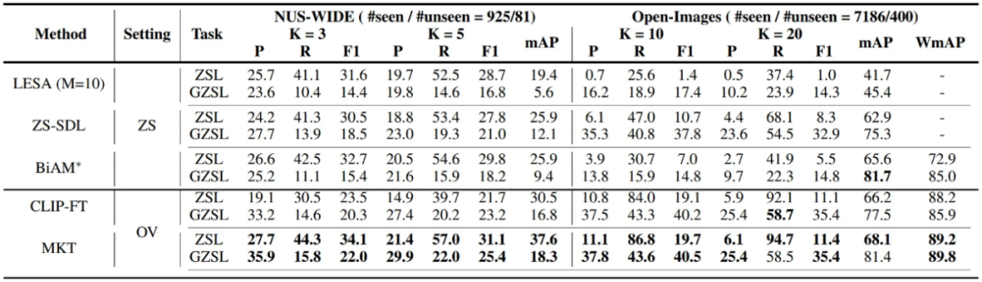 - 实验结果表明,MKT在NUS-WIDE公开数据集上的平均准确率达到了78.9%,在Open Images基准测试中也取得了65.7%的成功率;在Open Vocabulary多标签分类任务上显著超过了现有ML-ZSL方法,并成功地将基准测试准确率提升至当前国际最优水平。