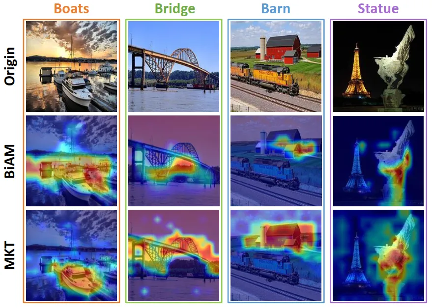 MKT 和 BiAM 的 Grad-CAM 可视化效果对比见图 4.。