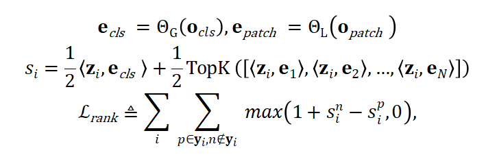 在处理一张图片时,在处理过程中首先经过分块(Patchify)输入 Vision Transformer 网络以获取代表整体特征的 CLS Feature 和代表局部特征的 Patch Feature。随后分别通过全局头和局部头将这些特征转换为 Embedding 空间中的表示。接着基于 Top-K 的方法计算局部头的相似度得分并与全局头的得分进行综合计算以获得最终预测分数,并通过排序损失(Ranking Loss)来优化模型: