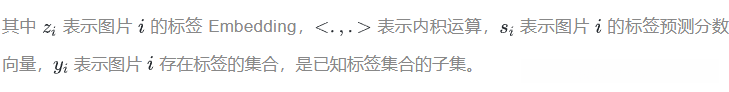 在图像与标签的嵌入对齐问题上,在从已知标签向未知标签的知识迁移过程中具有重要意义,并且在开放集合多标签分类任务中扮演着关键角色。由于CLIP模型在预训练阶段通过图文对比进行过广泛训练,在此过程中生成的图像与文本嵌入呈现出较高的相似度。研究者们通过知识蒸馏技术提取了CLIP模型多模态特征表示能力的关键信息,并成功地促进了图像嵌入与其相关联的文本嵌入之间的更加精准的对齐关系。所采用的蒸馏损失函数如下式所示: