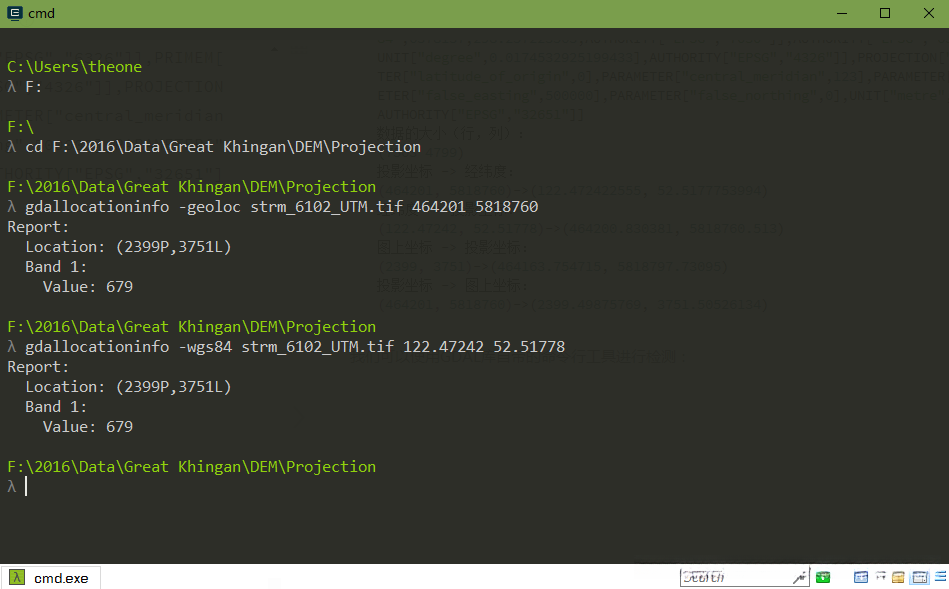 其中参数-geoloc代表所使用的地理坐标为投影坐标。-wgs84指定的是基于WGS84参考系的地理坐标的经纬度数值。输出结果对应于地图上的行列号位置信息。有关具体可用参数的详细说明,请参阅gdallocationinfo的帮助文档。