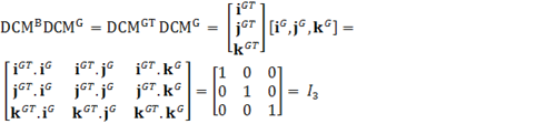另外, 通过观察可以得出以下结论: 我们能够发现, DCMB 等于 DCMG 的转置乘以 DCMG, 即 DCMB = (DCMG)^T \cdot DCMG, 而 DCMG 则等于 DCMB. 换言之, D(MB)^T = I_3, 其中 I_3 是一个 3×3 的单位矩阵, 换言之, DCM 是正交矩阵
