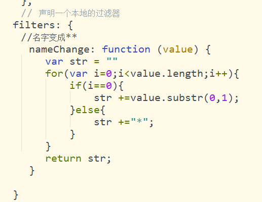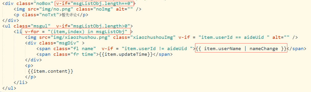 通过vue指令 v-if来判断是否有留言,msgListObj为留言数据,通过接口获取,v-for指令来循环显示出留言,nameChange为自定义过滤器,将用户姓名以姓**的形式匿名展示,过滤器代码如下: