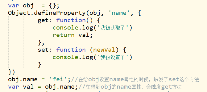 已经了解到vue是通过数据监听的方式来做数据绑定的,其中最核心的方法便是通过Object.defineProperty()来实现对属性的监听,那么在设置或者获取的时候我们就可以在get或者set方法里,调用其他的触发函数,达到监听数据变动的目的。(有兴趣的小伙伴可以再深入研究,这里篇幅有限只做简单介绍)