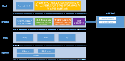 2、第二阶段 :随着直播活动的逐步推广,使用用户增多,直播频率也越来越高,“单活动架构”在应对业务量上涨方面已经越来越吃力。因此本次优化的思路就是解耦,让共性通用的业务字段可以进行配置管理。这个阶段在这里暂且称“简业务架构”(因为它只能覆盖业务范畴的一部分)。