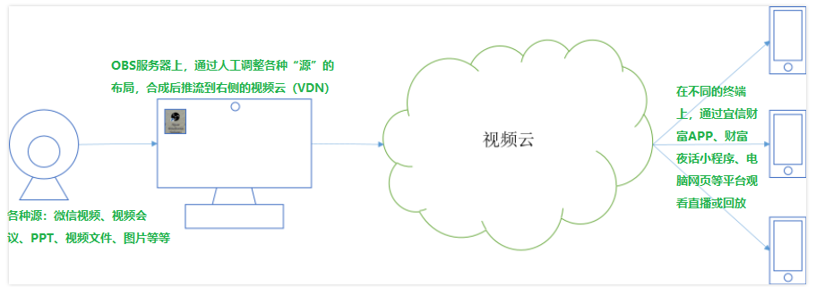 首先介绍一下直播的流程。通过下图做一个简要的介绍,首先看左侧两图的部分,在一台满足推流条件的电脑上安装OBS直播推流软件,把要展示给大家看的内容,专业术语称为“源”,如微信视频、PPT、图片、视频文件等等在OBS中调整好布局,形成场景,合成为可以在互联网传播的视频流,通过网络(此处指OBS电脑所在的网络,一般是家庭宽带和公司办公用网)上传到视频云服务器(VDN,在全国乃至全球有多个节点,实现终端就近连接视频服务器观看,减少跨国或是跨地区带来的网络不稳定、质量不高等问题),然后咱们的客户和同事就可以通过手机上的宜信财富APP、财富夜话小程序、星火金服APP进行观看啦。