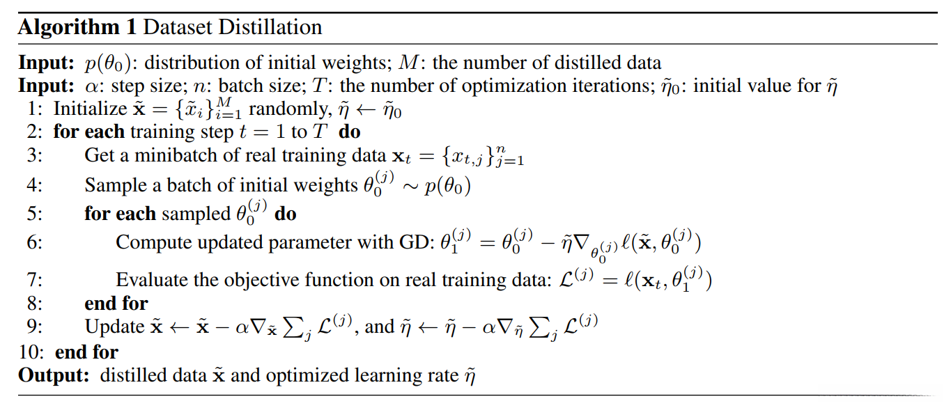 提出了数据的蒸馏方法,使用真实数据在蒸馏模型上进行测试作为损失函数,反向传播更新蒸馏数据,缩小测试损失;证明了合成数据对于训练模型的有效性,但准确率还有较大提升空间,可以尝试推广到更高分辨率的数据集上。