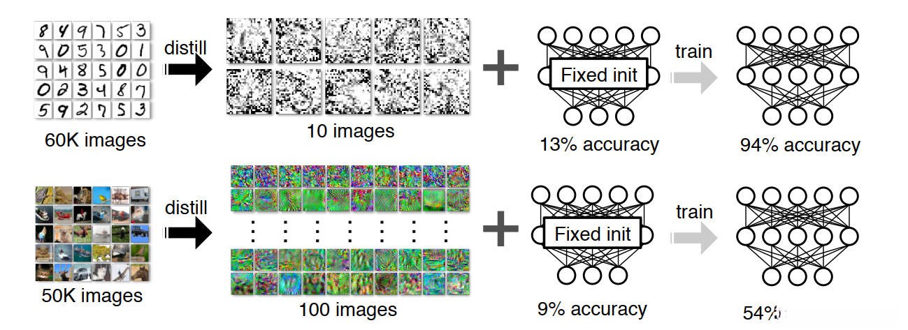 作者从知识蒸馏中得到启发,传统的知识蒸馏目的是从复杂模型中蒸馏出知识让简单模型进行学习,从而让简单模型的性能能够接近复杂模型,类比提出了数据集蒸馏。数据集蒸馏定义为:固定训练的模型,从大型训练数据集中蒸馏知识让小型训练集学习,从而让小型数据集训练的模型性能能够接近在大型数据集上训练的模型。
