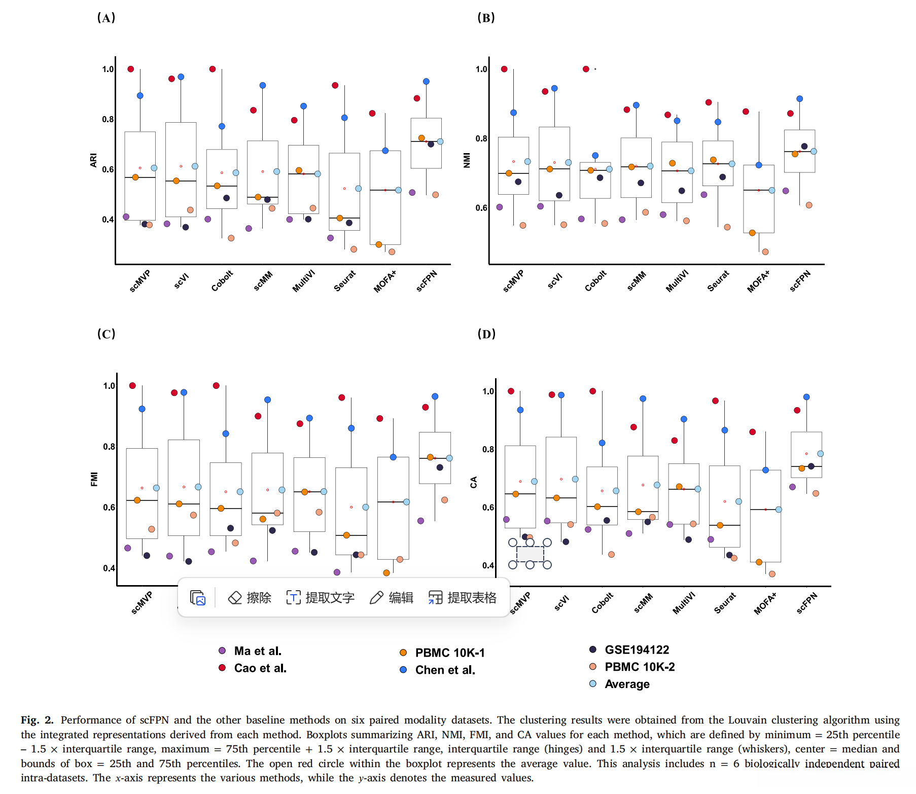 具体而言,scFPN 首先通过模态特定的变分自编码器(VAE)和特征金字塔网络(FPN)对每种组学数据进行嵌入学习。随后,学习到的分层嵌入被融合,并输入到一个双重自监督优化模块中,用于吸引相似细胞、分离不同细胞。作者在六个来自不同测序平台的最新数据集上进行了全面实验,结果表明,scFPN 在多种先进方法中表现出优越性。更重要的是,通过对去噪和原始数据的补全分析,scFPN 在标记物富集分析中展示了生物学上的可解释性。
