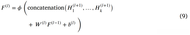 其中,ϕ是激活函数,Hk(l+1) 表示模态 xk在第 l+1 层的特征。术语 F(l−1)指代 FPN 在第 l−1层的特征,而 W(l)和 b(l)分别表示权重矩阵和偏置参数。由于原始输入特征的数量在模态之间有所不同,从第二层开始融合异质特征。因此,F(0)=concatenation(H1(1),…,Hk(1))。