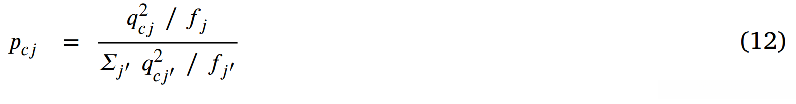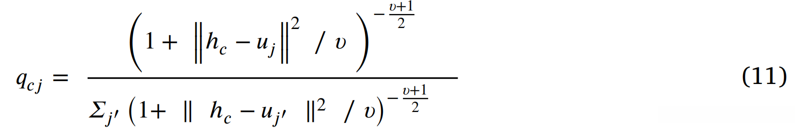 其中,qcj表示将细胞 c 分配到簇 j 的概率。该分配概率通过细胞 c 的嵌入 hc和簇中心嵌入 uj 之间的相似性,利用 Student 的 t-分布来量化,如下所示: