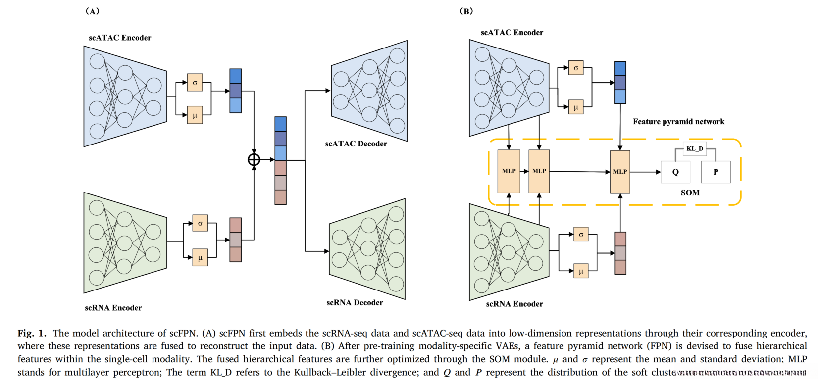 事实上,每种模态数据的分层特征可以通过特征金字塔网络(FPN)[18] 实现交互。FPN 使用自上而下的架构和横向连接,在多个尺度上构建高层语义特征图。该设计作为通用特征提取器在多种应用中表现出色。受 FPN 模型的启发,作者提出了一种单细胞多模态融合方法 scFPN ,通过开发特征金字塔网络高效整合分层特征以学习联合表示。scFPN 首先通过模态特定的变分自编码器(VAE)对每种模态数据进行嵌入。然后,scFPN 高效地融合每个网络层的跨组学分层特征,并通过特征金字塔网络形成联合表示。为进一步优化联合表示,作者引入了一个双重自监督优化模块(SOM)[19],用于吸引相似细胞并分离不同细胞。最终,变分自编码器和 SOM 模块同时进行优化。