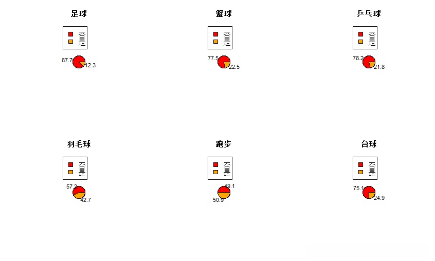由图3-6所示数据可知:跑步、羽毛球及台球项目在被调查大学生中颇受欢迎,在总人数中分别占据50.9%、42.7%和24.9%的比例;相比之下足球运动吸引力最低仅占12.3%,吸引力相对不足