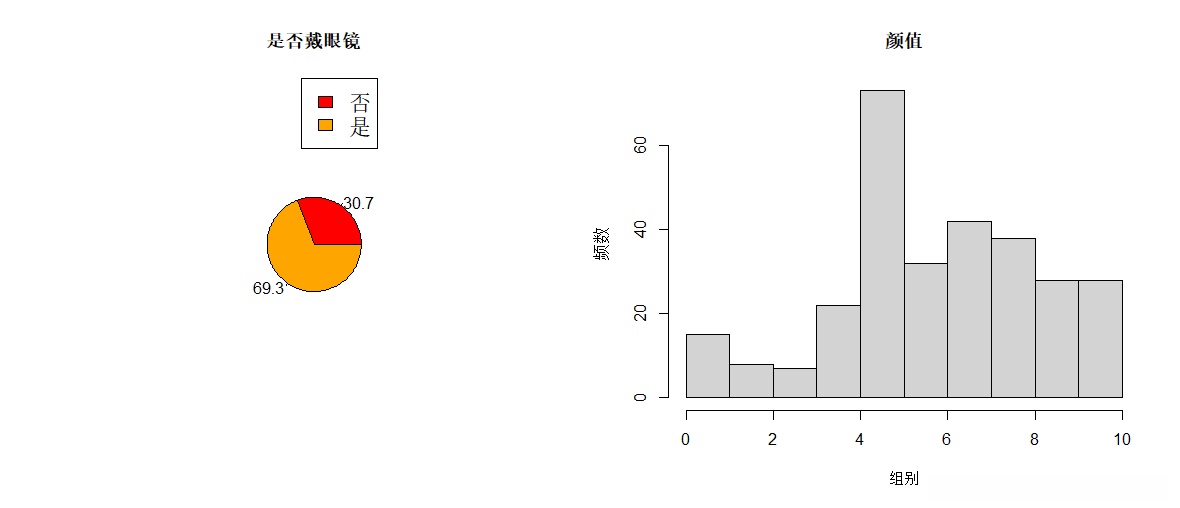 观察图3-8的数据可以看出:约有69.3%的学生普遍佩戴眼镜,在总样本中占比达一半以上;约有40%的学生的颜值得分位于4至5分区间内,并且这一区间的人数显著高于其他分数段的群体;与低颜值群体相比,在高颜值区间的人数更多,则主要集中在4至10分区间内,并且具有较低水平的群体占比不大。