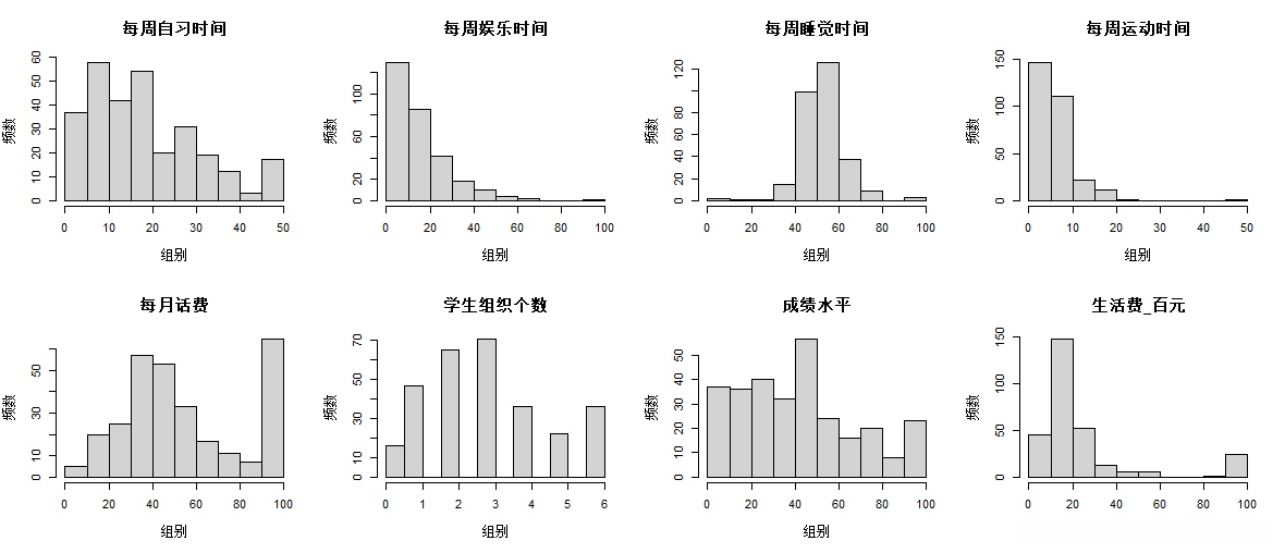 hist(a$生活费_百元,main="生活费_百元",xlab="组别" ,ylab = "频数")