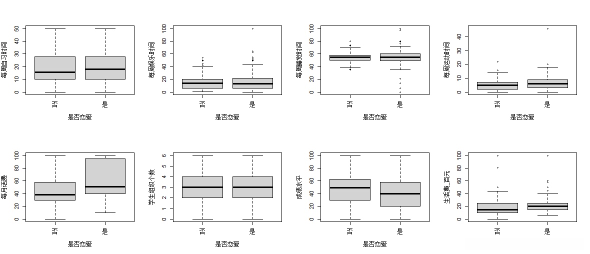 根据图3-11的数据可知:生活规划的变量在恋爱与否方面并非完全表现出显著差异。通过箱线图可以看出:分别包括每月话费、成绩水平以及生活费这几个指标,在恋爱与否方面表现出较大的差距。其他指标之间的差距则相对较小或基本没有明显的不同。
