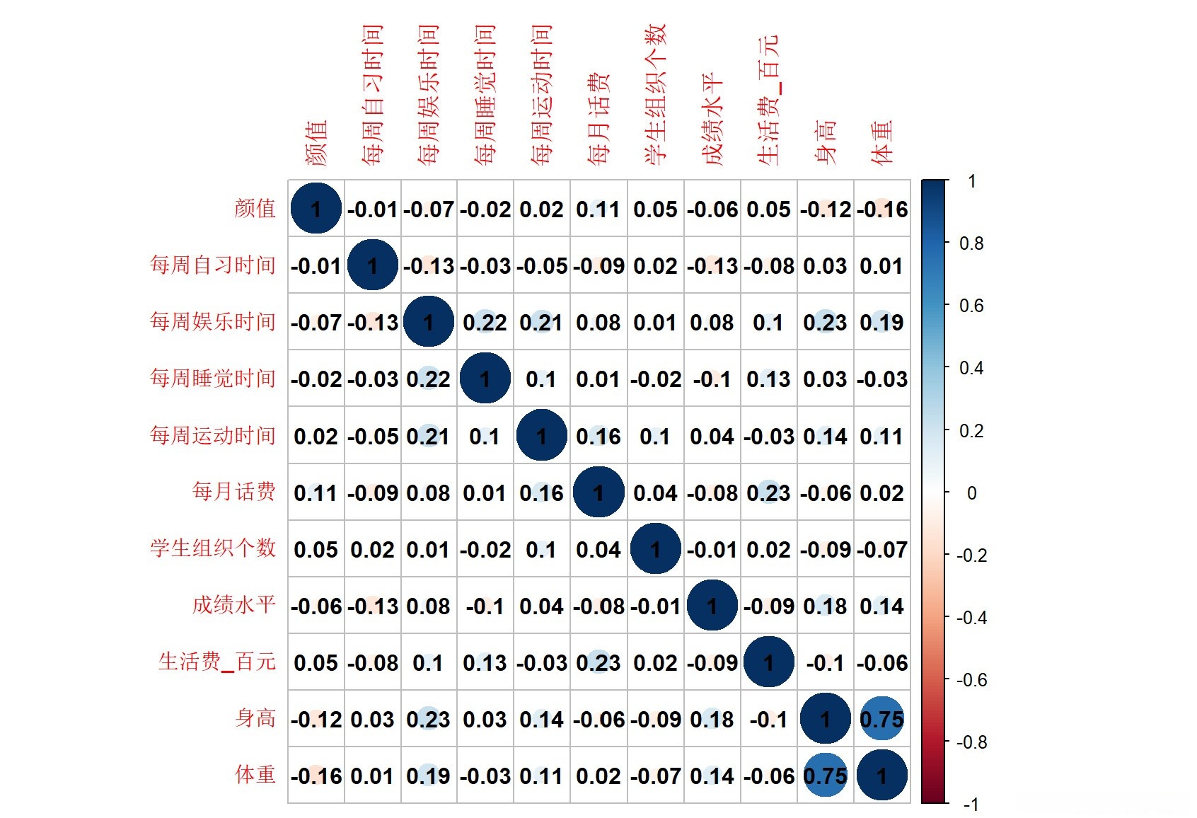 由图3-10可以看出:除了身高与体重之间的显著相关性之外,在其余各项指标之间不存在明显关联关系。其中身高与体重的相关系数达到了R=0.75(属于中等程度的正向关联),而其余各项指标间其绝对值均不超过R=0.25(即其关联程度很低)。