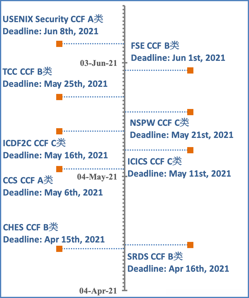 以下为近期截稿的CCF推荐,网络与安全领域会议,按照时间排序。