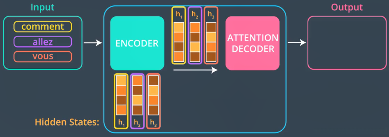 通过一种改进的方法将我们的所有hidden states作为向量输入至decoder中。从而保持了输入中的全部信息。在解码第一个单词时,则采用与其最邻近的context即我们的h₁。当处理第二个单词时,则使用h₂作为其上下文这一假设的前提是我们认为h₁是与第一个词最邻近的状态序列,h₂则是与之对应。然而,在某些情况下我们知道最邻近的具体hidden states并不明确因此必须由多个hidden state共同表示以确保信息的有效传递在这种情况下该如何选择这些hidden states呢?