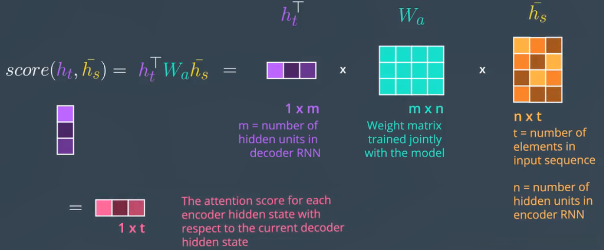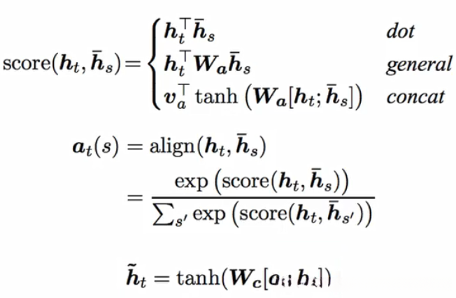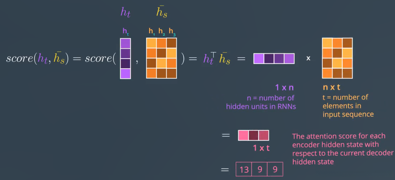 这张图直观地展示了点乘运算的过程。其中 ht 代表解码器层中上一层的输出结果,hs 则是由编码器层所有隐藏状态组成的矩阵。通过与目标向量进行点积运算可以得到对应的权重系数。