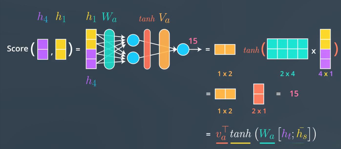 加法注意力通过将encoder中的前一个隐藏状态与decoder中的所有隐藏状态进行连接来实现信息传递。随后我们对这些连接后的特征进行全连接运算,并经过tanh函数处理后乘以另一个权重矩阵来获得最终输出值。以下插图很好地解释了这一过程。