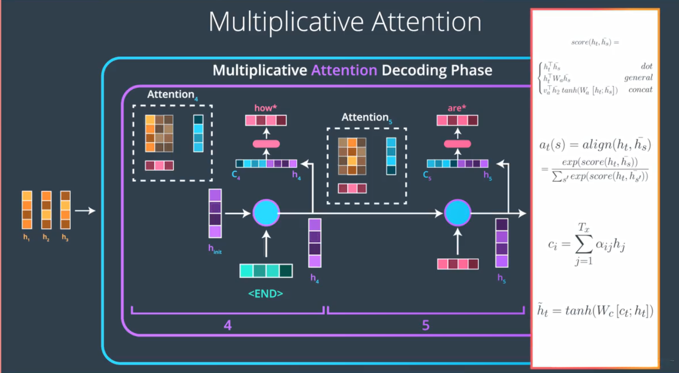 注意机制主要分为加法注意力与乘法注意力两种类型。其中乘法注意力机制是基于加法注意力进行改进提出的开创性研究方法。该研究方法首次提出的两篇论文分别是基于注意力机制的神经机器翻译的有效方法以及神经机器翻译:同时学习匹配和翻译,感兴趣的朋友可以进一步查阅相关文献以获取更多细节信息。在乘积型注意机制中包含两个评分函数:第一个评分函数采用解码器隐藏状态与编码器所有隐藏状态点乘的方式计算;第二个评分函数引入了权重矩阵wa,并采用解码器隐藏状态与编码器隐藏状态按元素相加后再与权重矩阵wa相乘的方式进行计算。接着我们通过应用全连接层后使用tanh激活函数、再结合softmax概率分布层对输出进行处理以获得最终结果