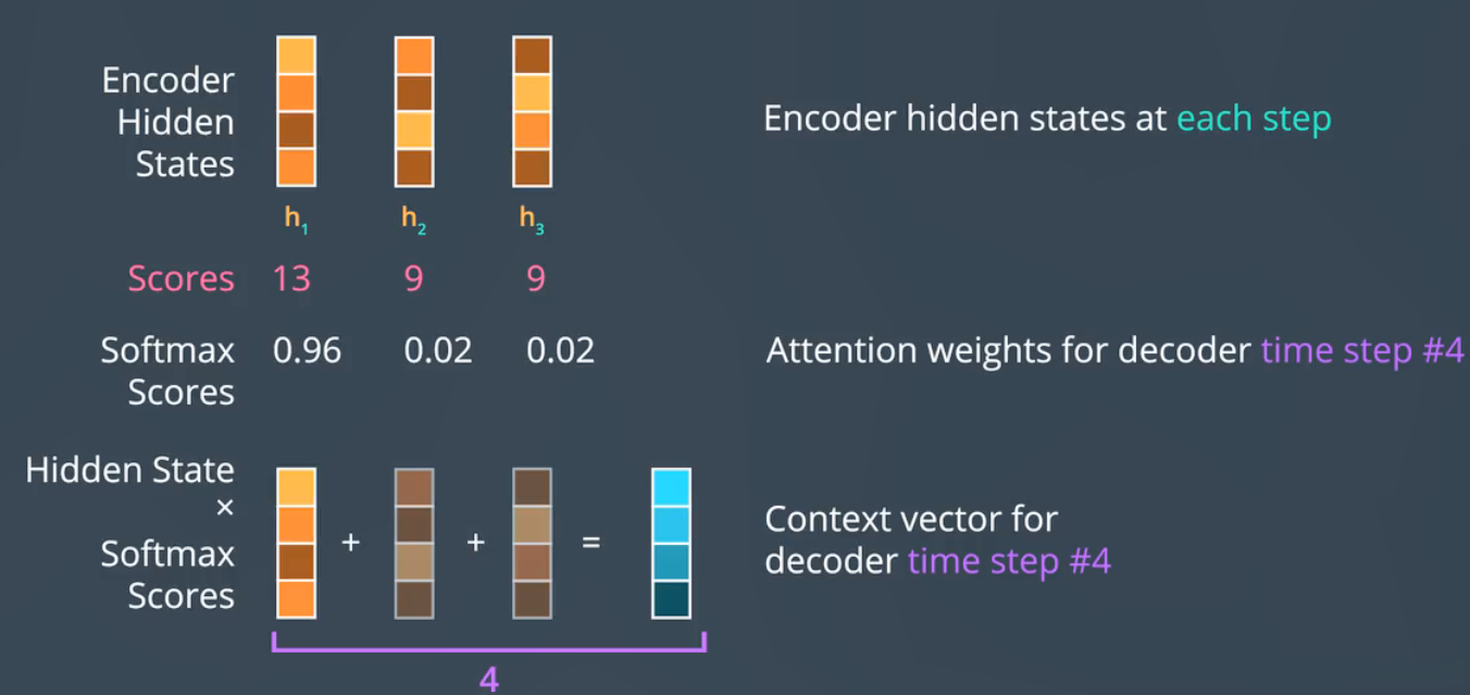 其主要功能在于能够识别并提取与任务相关的hidden states,在开始计算时,我们已经获得了所有可能的hidden states。随后我们将注意力机制的时间步参数设置为3,在这一阶段,根据注意力机制采用的得分类函数(详细内容将在后续部分阐述),系统计算出h1得分为13分,h2和h3各得9分。通过归一化处理获得各隐藏状态对应的权重比例,并将这三个隐藏状态分别按照其权重进行加权相加以生成最终的context向量。
