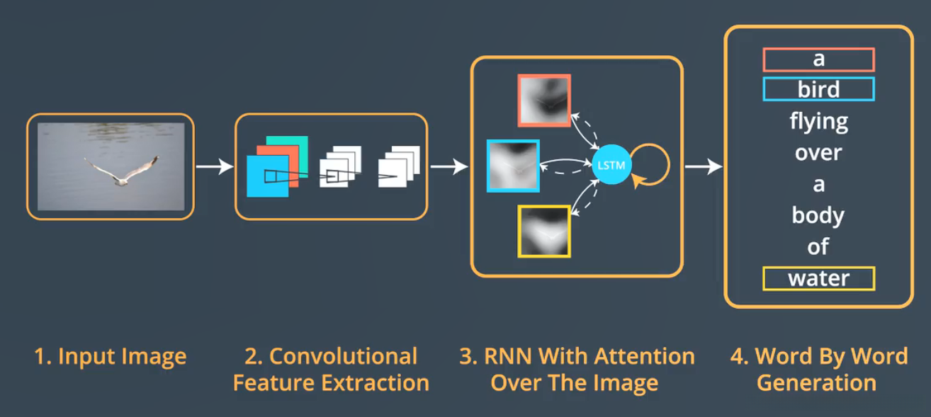 如果感兴趣的话,请参考一下这些论文中的一个例子:Show, Attend and Tell: Neural Image Caption Generation with Visual Attention这篇论文中指出,在给定一张图片作为输入时,结果会生成该图片的文字说明。