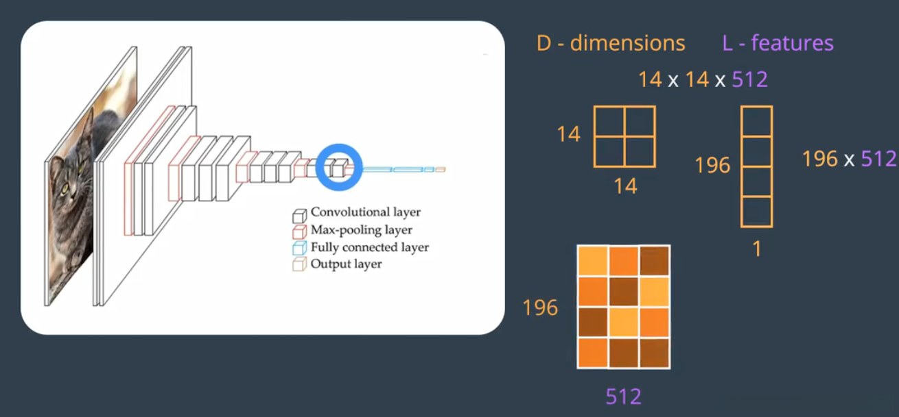 该解码器采用卷积神经网络架构,并基于循环神经网络设计编码器。该编码器输出的空间维度为14×14。随后我们将二维的向量展平后变为一个长度为一十九六的一维向量接着我们有五个一十二个这样的隐藏状态连接成一个大小为一九六乘以五十一二的矩阵随后在解码器模块中引入注意力机制以提升生成质量