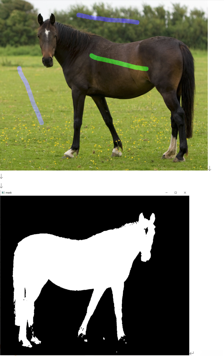 pf, pb = np.exp(pf), np.exp(pb)# 计算整个图像img对于gmf和gmb模型的得分,即每个像素属于某个高斯分布的概率。