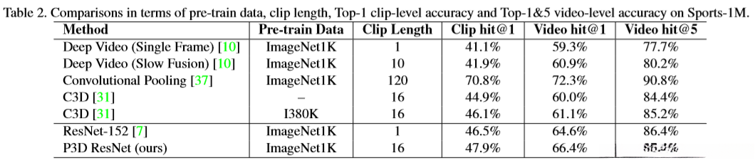 - 表2总结了性能和比较。总体而言,我们的P3D ResNet相对于ResNet-152(2D CNN)和C3D(3D CNN)的性能提高了1.8%和5.3%(顶级1视频级别的准确性) , 分别。结果基本上表明了通过将3D学习分解为空间空间中的2D卷积和时间维中的1D操作来探索时空信息的优势。不出所料,在整个网络中融合时间信息的深度视频(慢融合)比仅利用一个帧的深度视频(单帧)表现出更好的性能。尽管深度视频(慢速融合),卷积池和我们的P3D ResNet的三个运行都利用了时间融合,但是它们在执行时间连接上的方式根本不同。深度视频(慢速融合)的性能是对空间卷积执行时间卷积以计算激活量的结果,而卷积池则是简单地最大程度地跨时间帧对最终卷积层的输出进行最大处理。结果表明,我们采用空间和时间卷积的不同组合的P3D ResNet改善了深度视频(慢速融合)。这多少表明P3D ResNet受益于网络设计中结构多样性的原理。同样不足为奇的是,P3D ResNet的性能仍然低于卷积池,后者对120帧的剪辑以1 fps的帧速率执行时间合并,使剪辑长度超过120s。相比之下,我们将16个连续帧作为基本单位,它仅覆盖不到0.5s的时间,但具有强大的时空连接,这使我们的P3D ResNet具有更好的泛化能力。