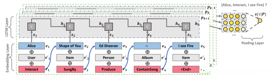 - LSTM能够记忆序列中的长期依赖关系,有助于推断连接用户和项目实体的路径以估计交互关系的置信度