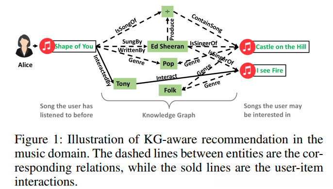 - 通过研究KG中的项目链接,用户和项目件的连接反映了其间的基本关系,这是对用户-项目交互数据的补充