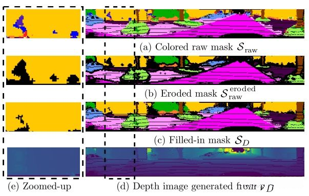 图3. 提出的种子填充算法处理步骤的可视化。给定(a) 原始语义地图,我们首先使用腐蚀来移除边界标号,和一些错误标号的区域,从而得到了(b)中的腐蚀掩膜。(c)我们最终通过邻居标号填充腐蚀的标号来得到一个更一致的结果。黑点表示空白像素,具有编号0。(d)展示了深度(e)展示了虚线框的内部区域。